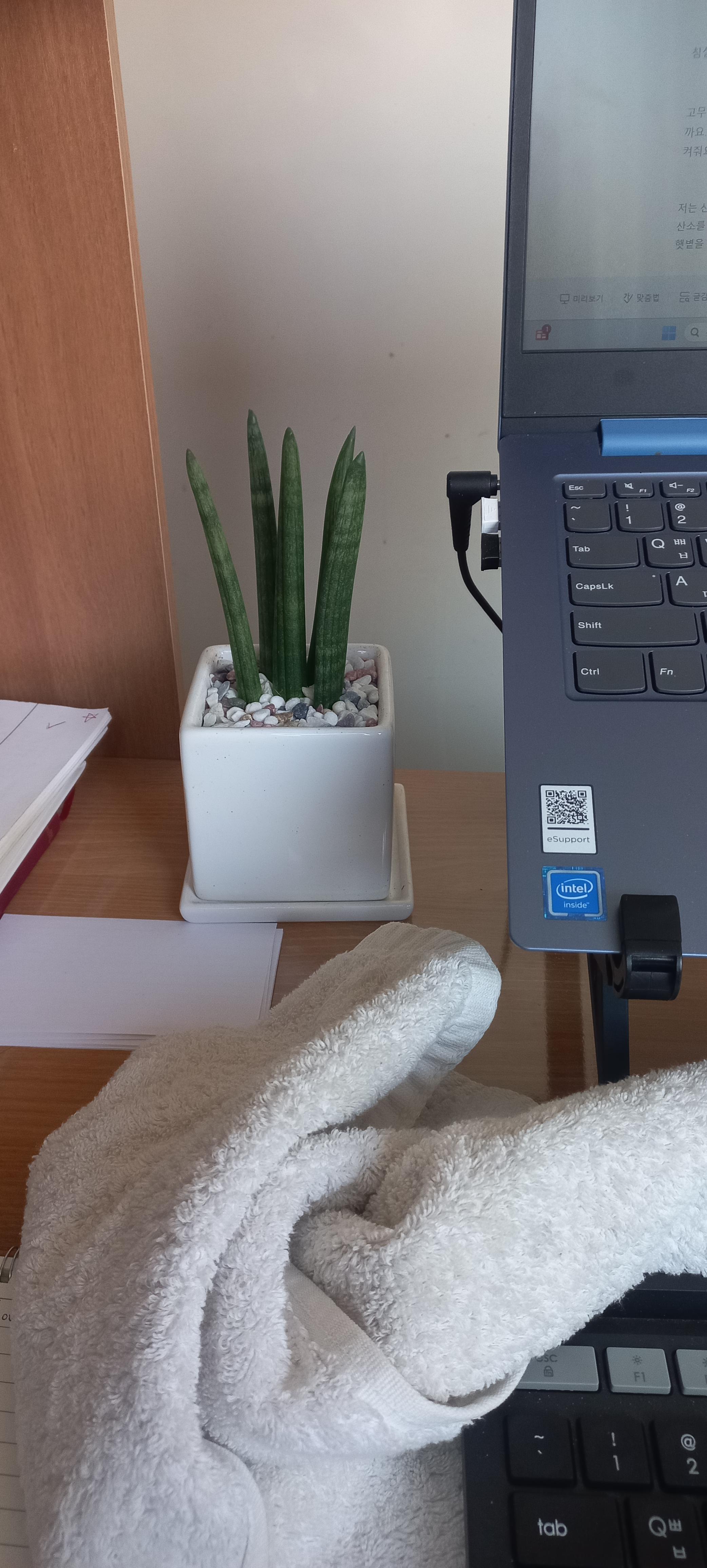 저는 산세베리아 식물을 키워요. 책상에 작은 화분을 두는 거에요. 전자파를 차단해주고 있어요. 늘 나와 함께해요.밤에는 산소를 뿜어줘요. 밤에 이산화탄소를 배출하죠. 그것을 전환시켜줘요. 정말 감사한 식물이죠. 그래서 저는 이것을 관리해요