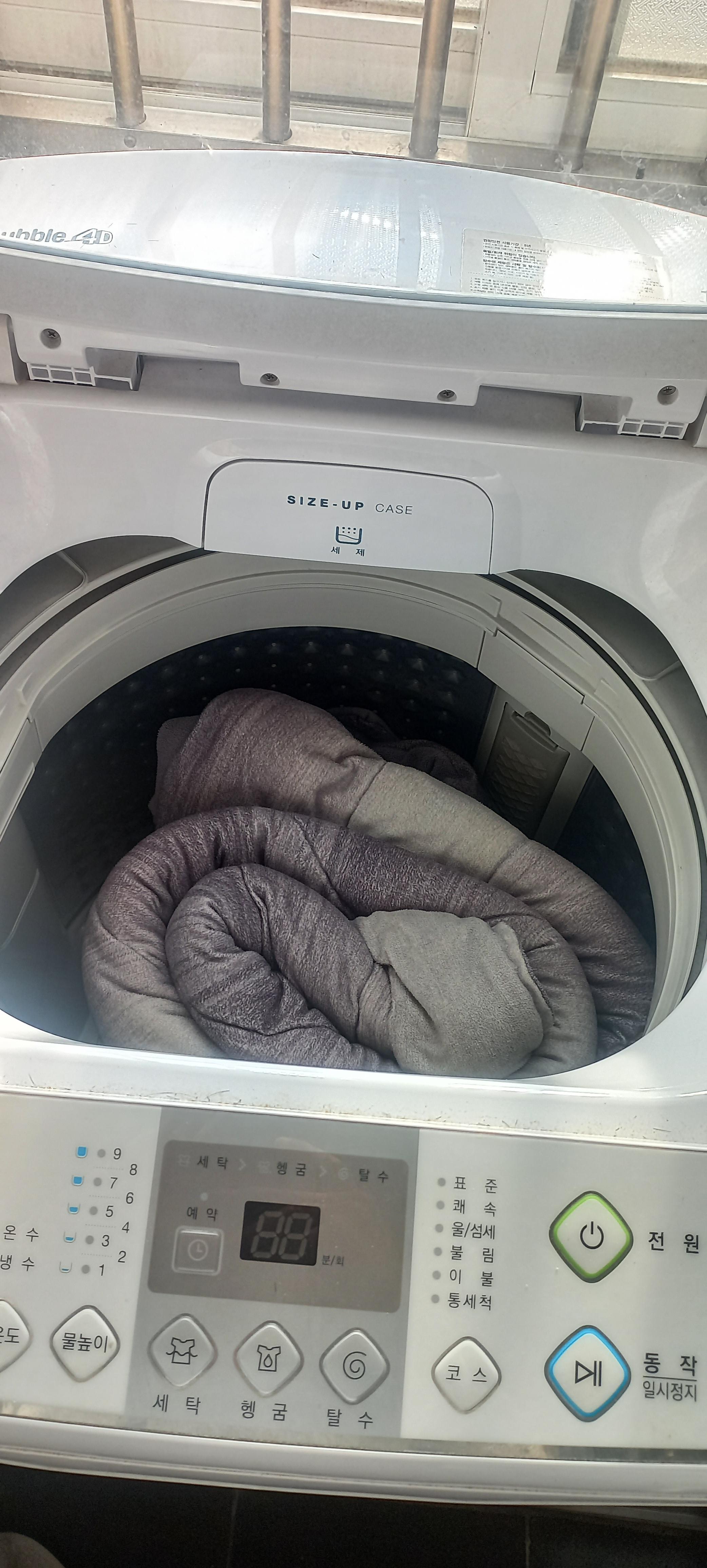 이렇게 세탁기에 넣어주세요. 그러면 이불세탁이 잘되요. 마구 집어 넣으면 세탁기가 망가져요. 탁탁 걸리는 소리 들어봤을 거에요 물세제를 이용했어요.